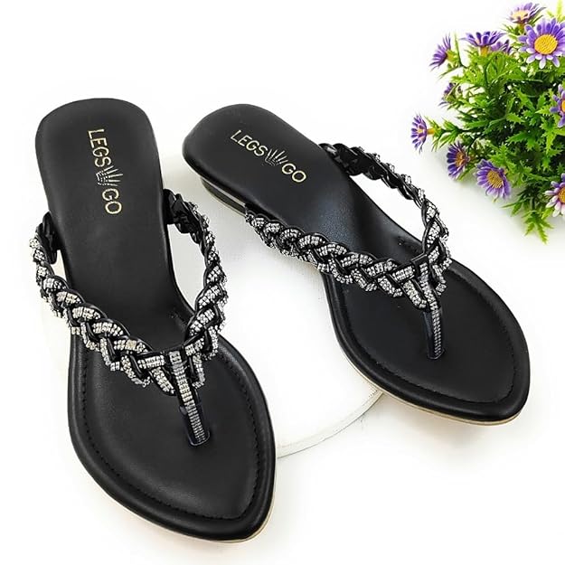 Women’s Casual Black Flats | Stylish Beaded Flip Flops